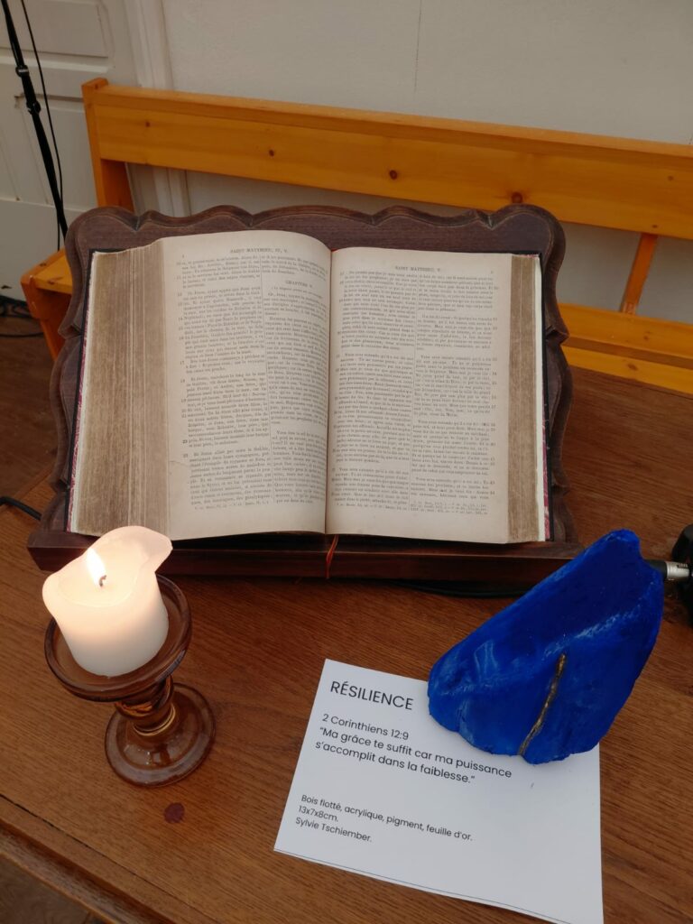 Après une prière d’illumination, place au texte biblique : Romains 5,1-8, suivi d’une lecture du texte sur la résilience et d’un parcours devant quelques unes des toiles.