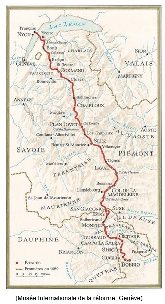 Mais cela n’empêcha pas les généreux Vaudois de subir maintes persécutions : une branche de leur communauté, revenue en Provence dans la région du Lubéron fut impitoyablement massacrée lors d’une « croisade » décidée par François 1er. Plus tard, les efforts de Louis XIV pour éradiquer « la Religion Prétendue Réformée » en France s’étendirent aux vallées alpines d’Italie et les Vaudois pourchassés durent quitter leurs villages incendiés pour s’exiler à Genève. Mais par la faveur d’un soutien diplomatique de l’Angleterre protestante, ils purent revenir – à pied par les sentiers alpins – dans leurs vallées en 1689. Cette équipée aventureuse, à travers mille dangers, des Vaudois conduits par leurs pasteurs marchant à leur tête, devint le mythe refondateur de leur communauté, revivant la marche des Hébreux conduits par Moïse vers la Terre Promise.