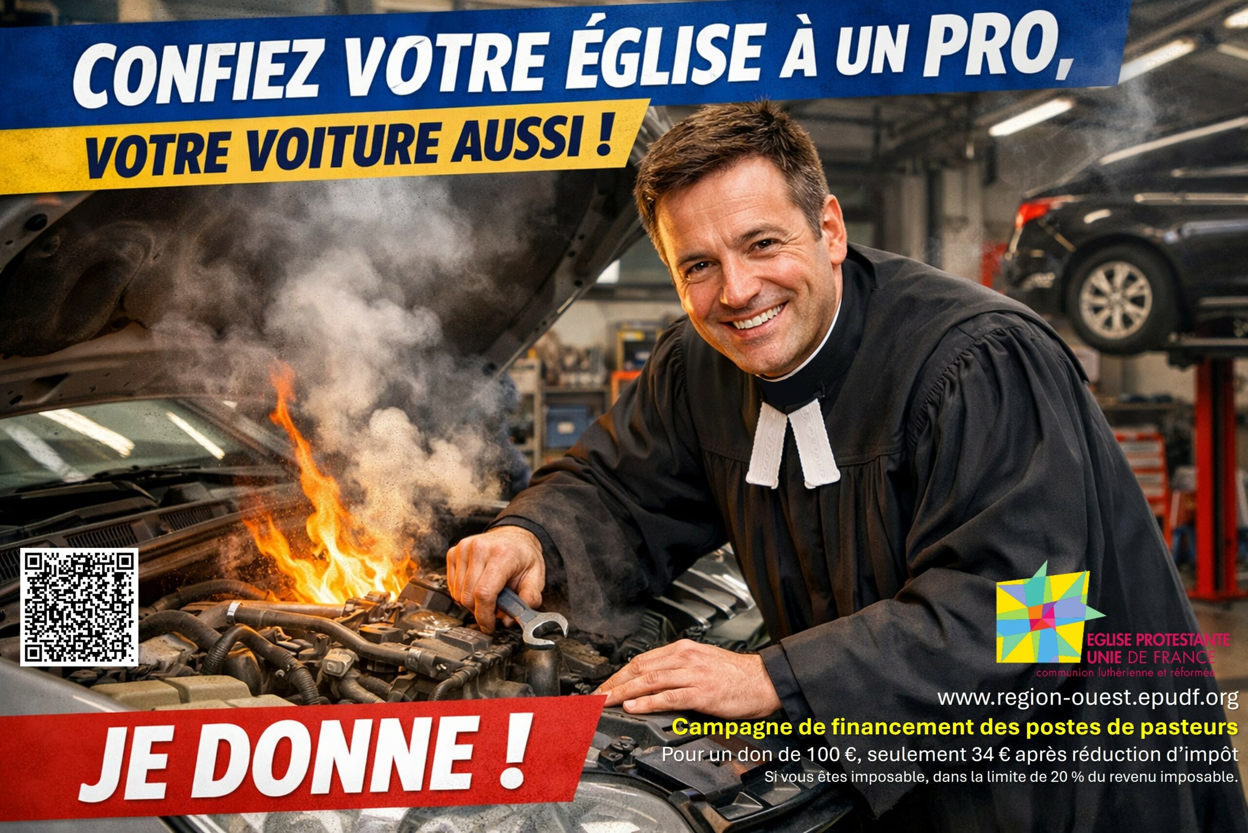 Un QR-code renvoie directement vers la page de don du site de l’EPUdF Région Ouest, via la plateforme Yapla.